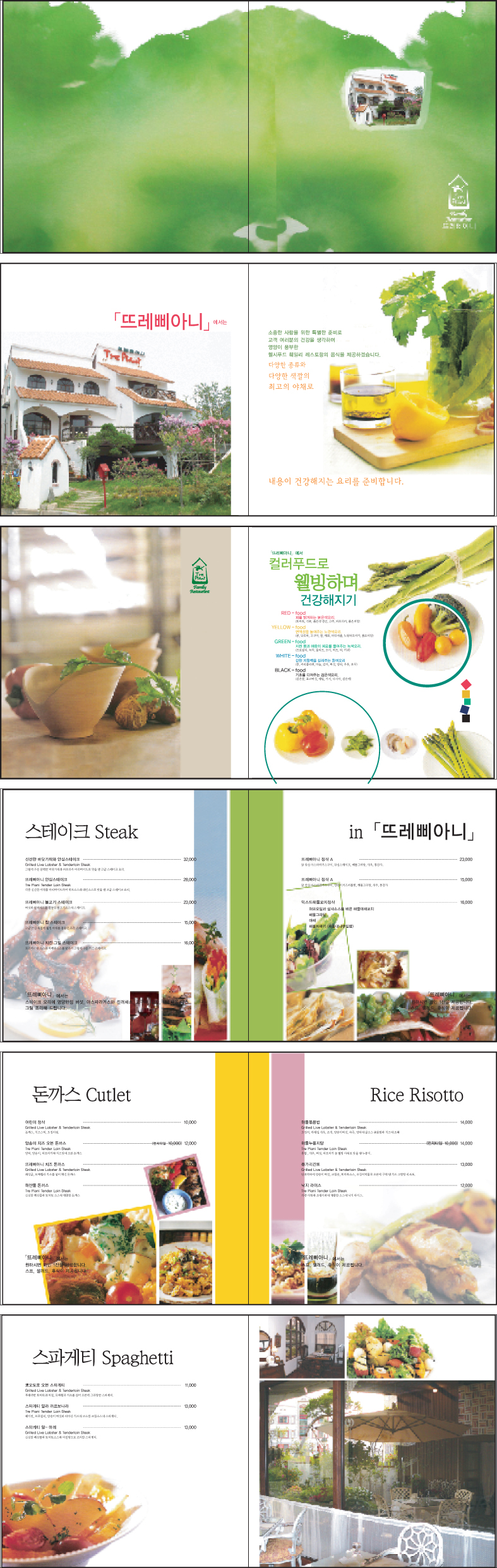 저라면 3단접지로 기획하고, 메뉴군은 파스타(스파게티,돈까스,리조또), 스테이크 두 페이지로 하고 주류나 와인리스트 페이지를 하나 추가로 만들거 같네요. 이미지는 각 페이지당 두컷정도의 고해상 이미지를 구해서 사용할거 같구요. 암튼 나름 제 분야라서 주절댔습니다.^^;